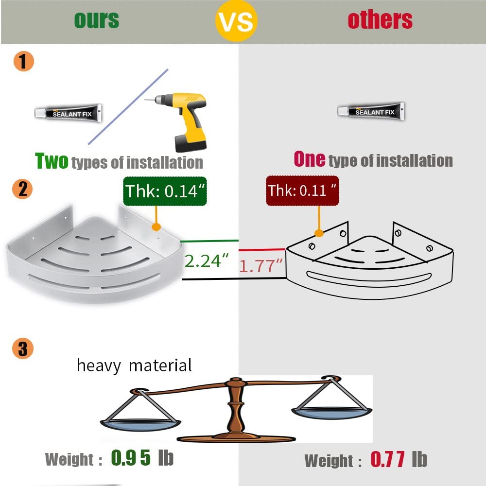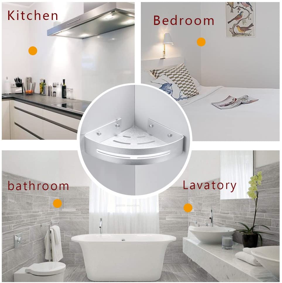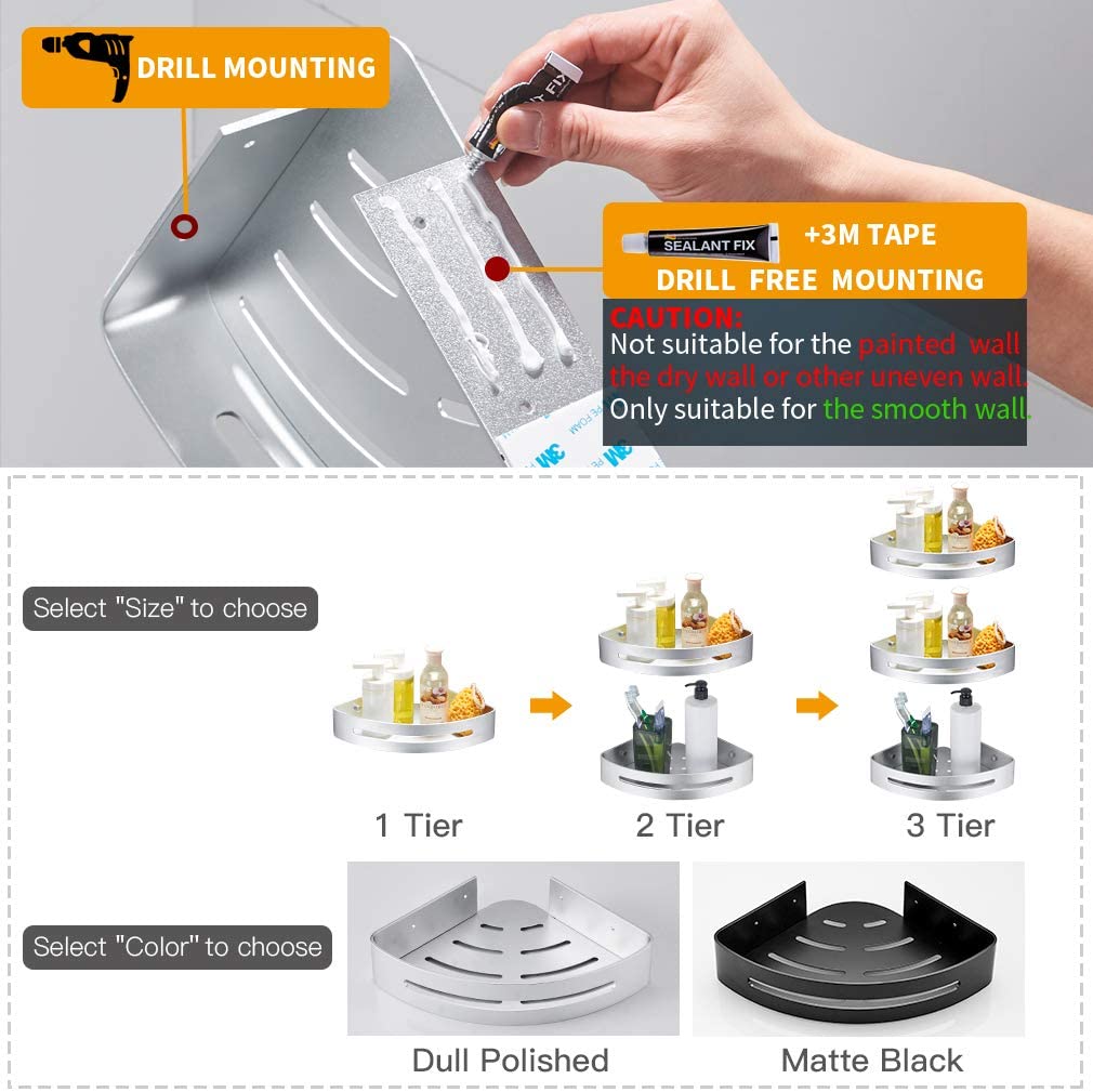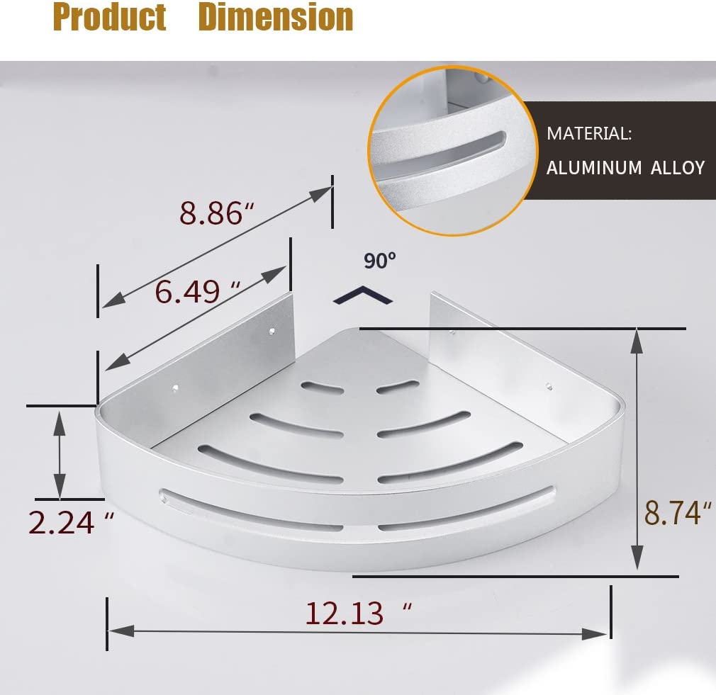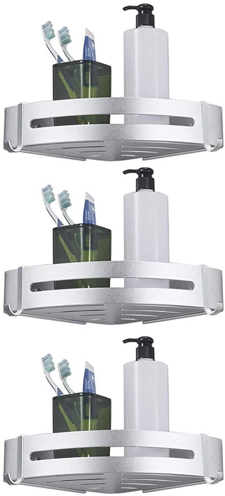BESy Shower Corner Caddy Bathroom Shower Corner Shelf with Two Hooks, Self Adhesive with Glue or Wall Mount with Screws,Heavy Duty Aluminum 3 Tier Storage Shelves Triangle Baskets,Dull Polished Silver
