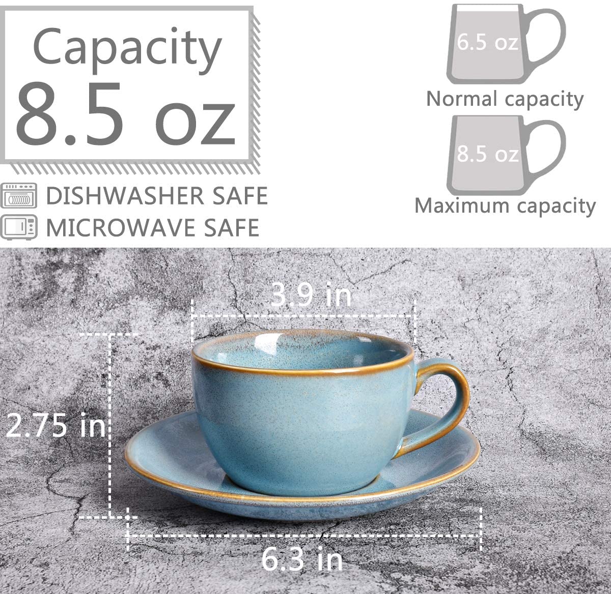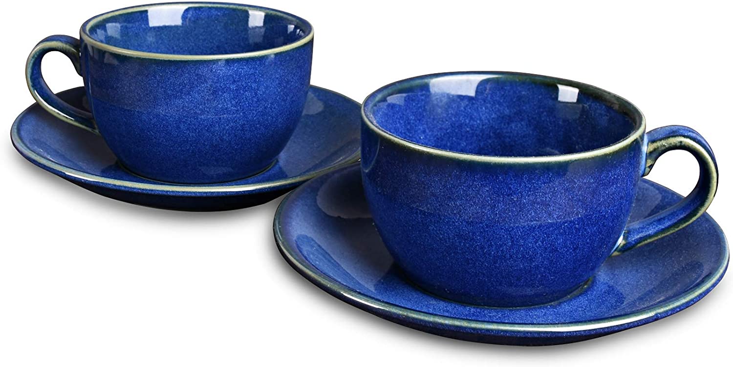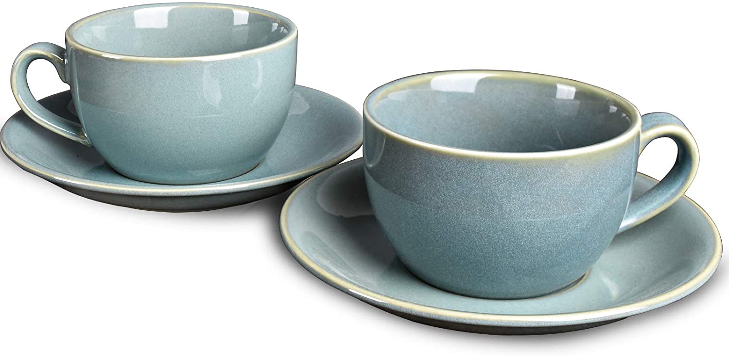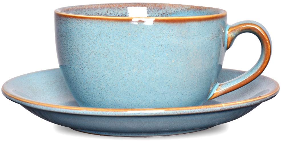 Bosmarlin Ceramic Coffee Cup Mug with Saucer Set of 2 for Latte, Cappuccino, Tea, 8.5 Oz, Dishwasher and Microwave Safe(Lake blue, 2)