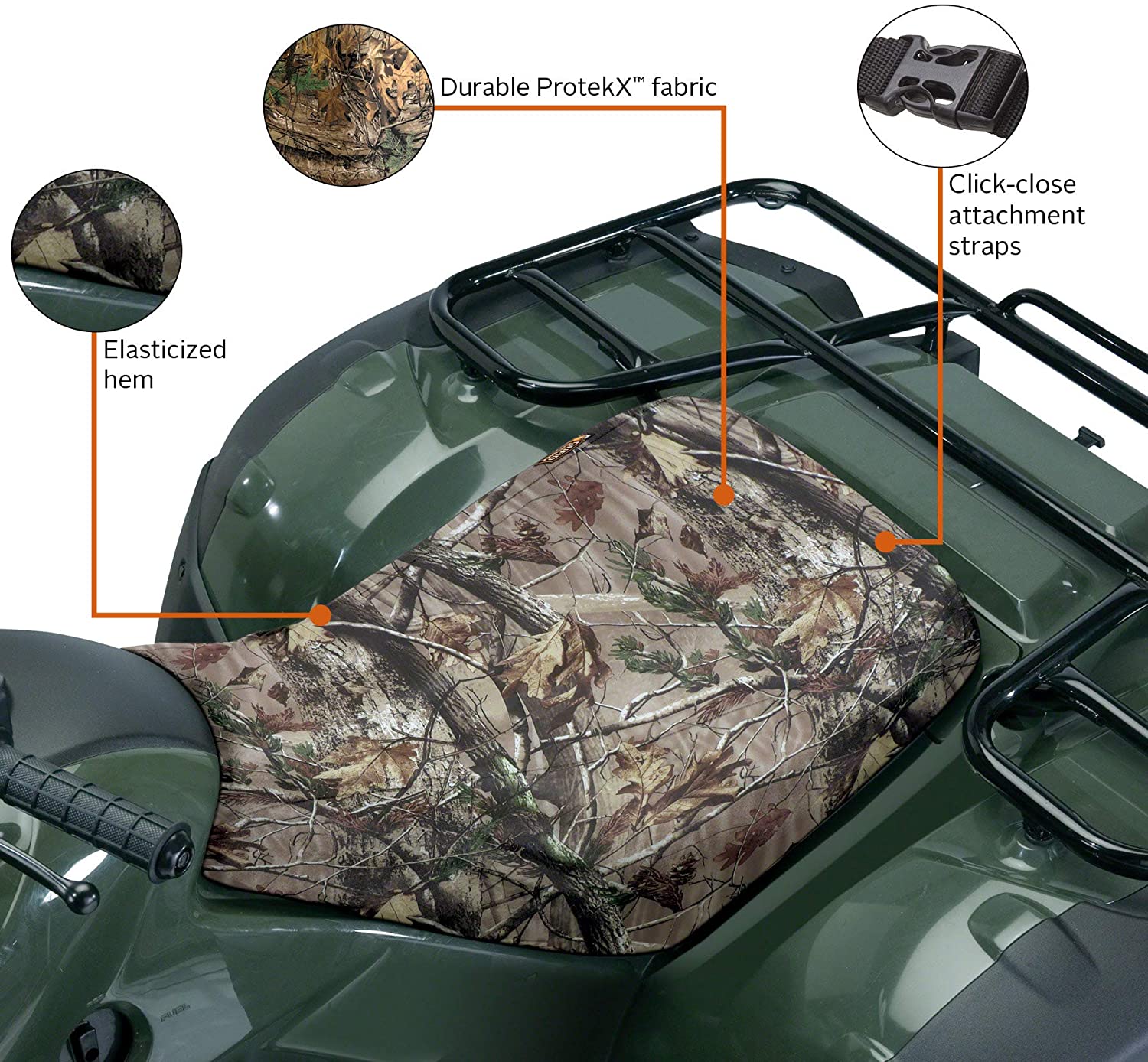 This product includes these features: Universal size fits most ATVs, 1 year manufacturer's warranty, Stick and leaf camo print, Protects ATV seat from rain and dirt.
