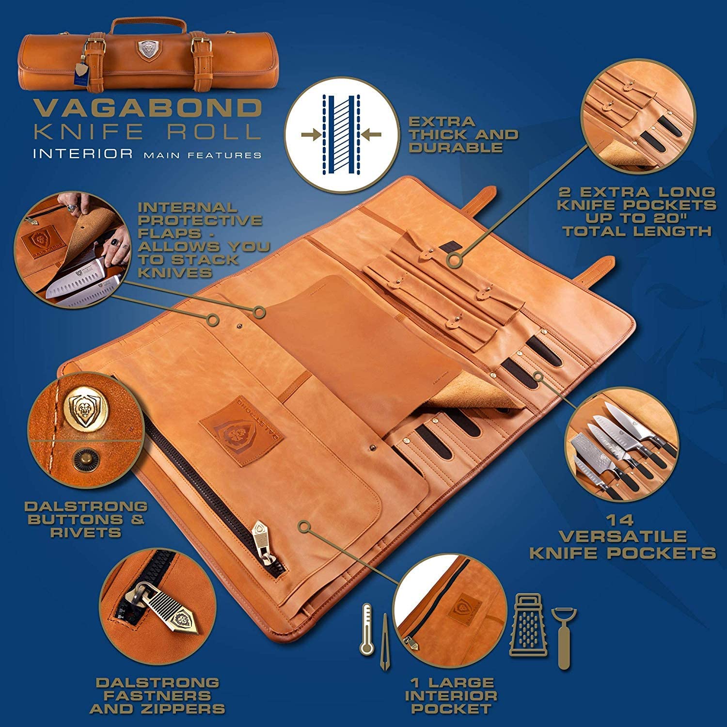 Dalstrong - Vagabond Knife Roll Full & Top Grain Brazilian Leather Roll Bag - 16 Slots - Interior and Rear Zippered Pockets - Blade Travel Storage/Case (California Brown) - Large - Up to 20" Knives