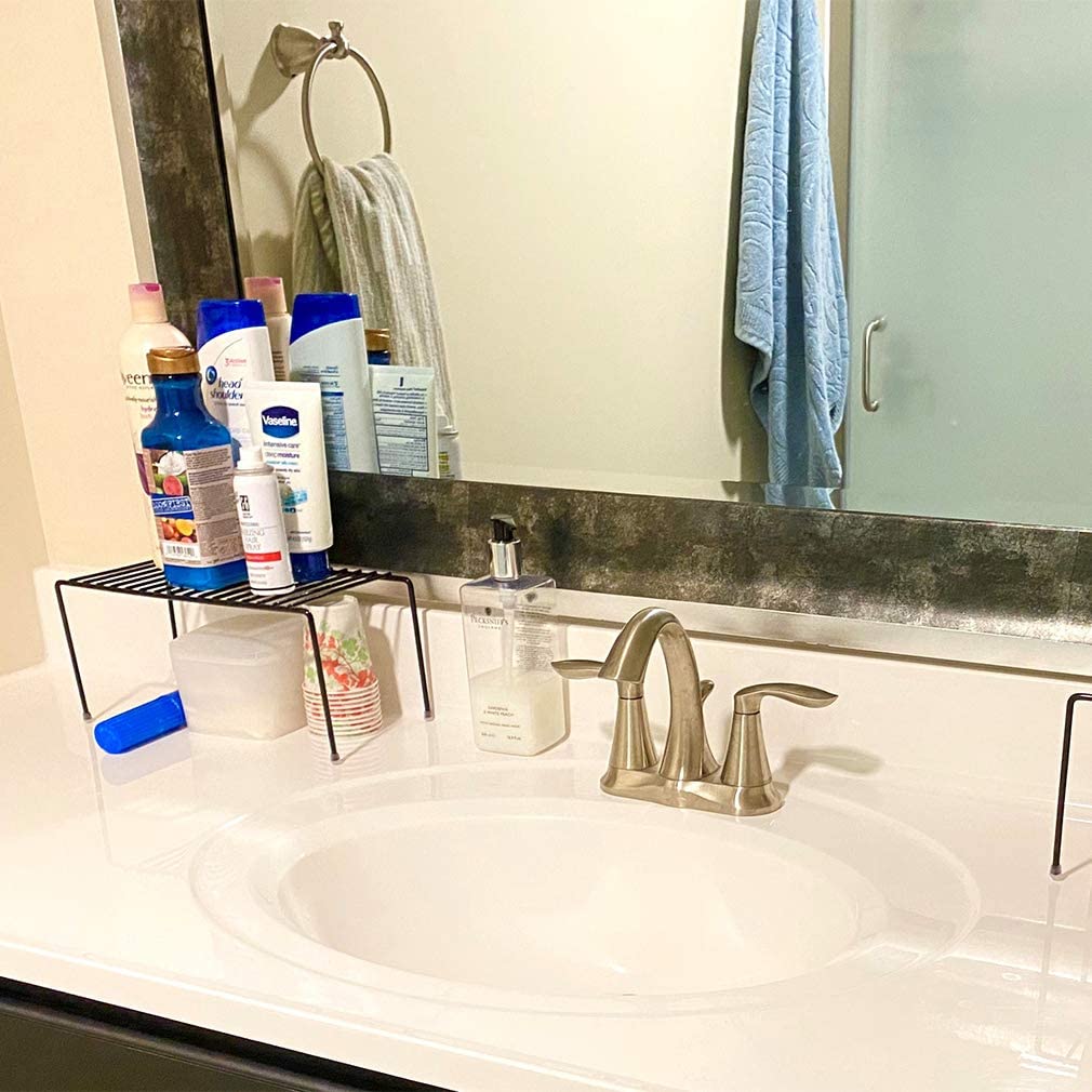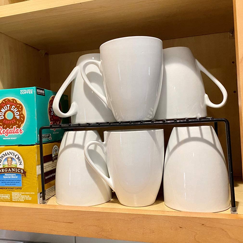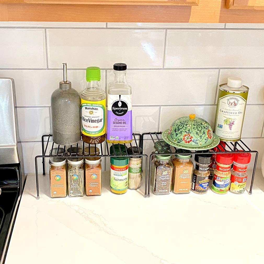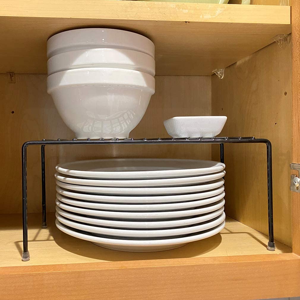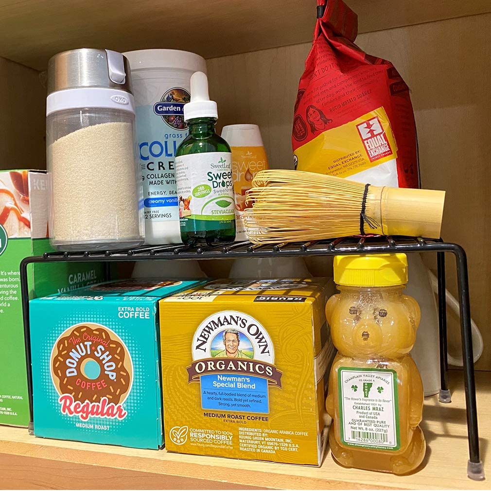 These helper shelves will double your space! Versatile shelves hold food, dishes, small appliances, pantry staples, toiletries, cleaning products, or anything you need to store in a small space. Perfect for maximizing storage and organizing in kitchen cupboards, pantries, bathroom cabinets, closets, countertops, under a sink, or anywhere you need extra room.