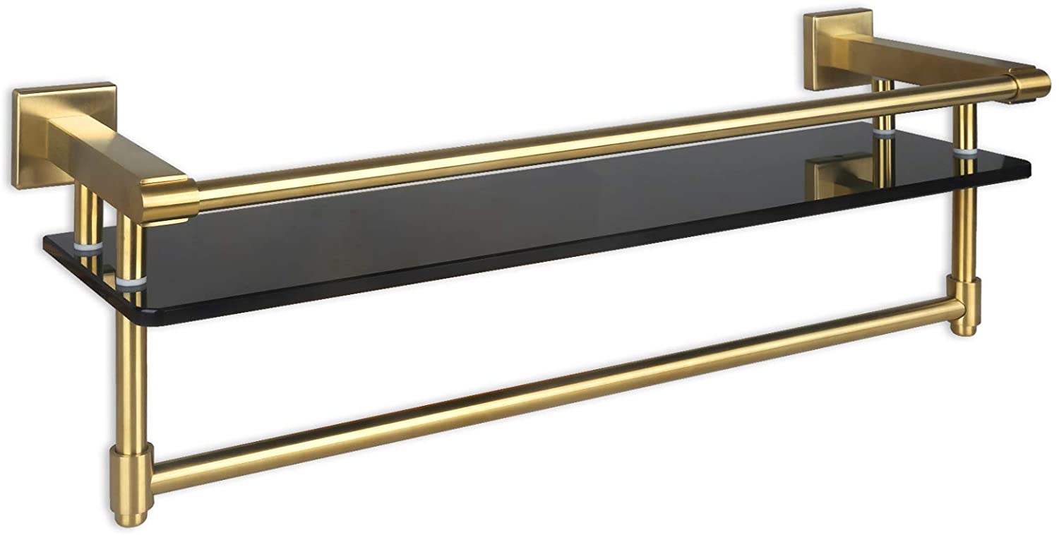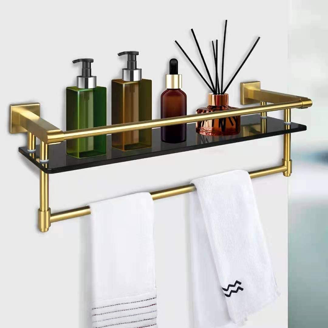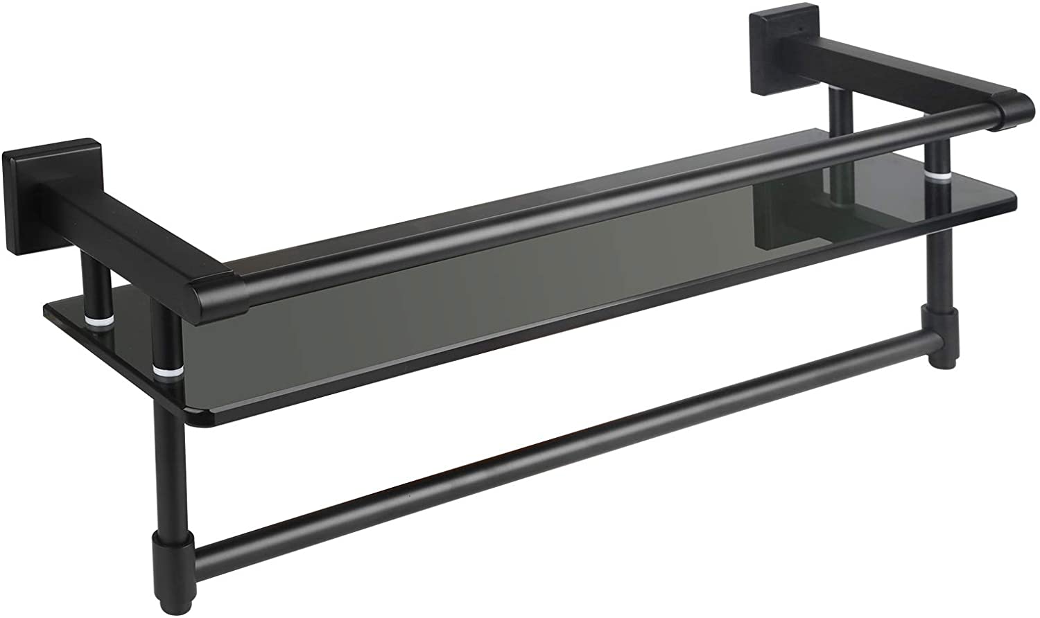 Glass Bathroom Shelf with Towel Bar and Rail Wall Mounted Extra 8mm-Thick Tempered Glass, Floating Shelf Rectangular (Matte Black)