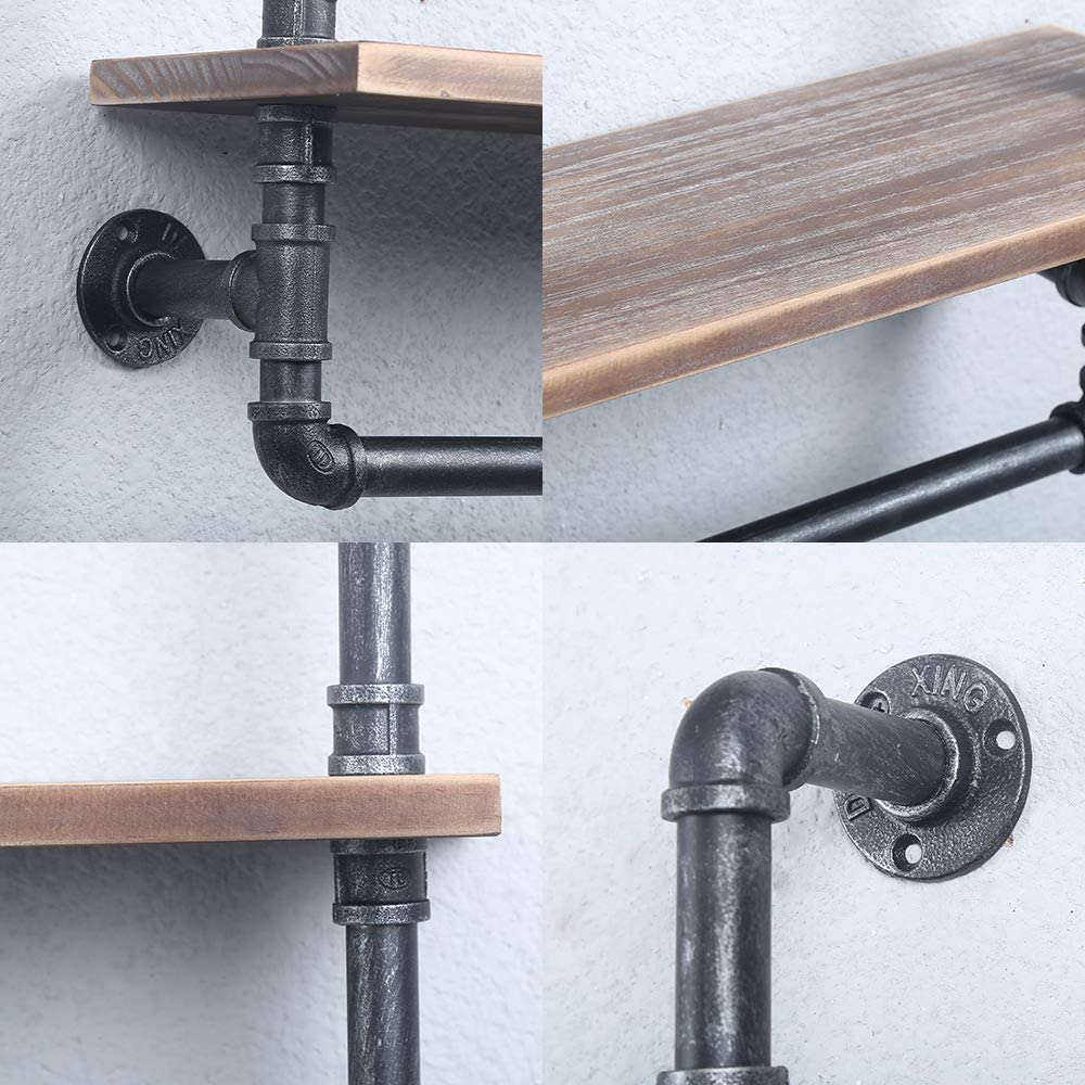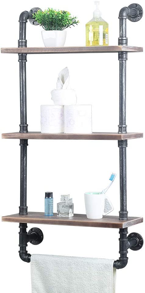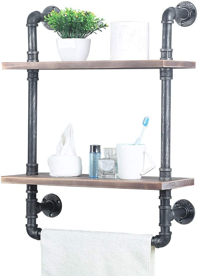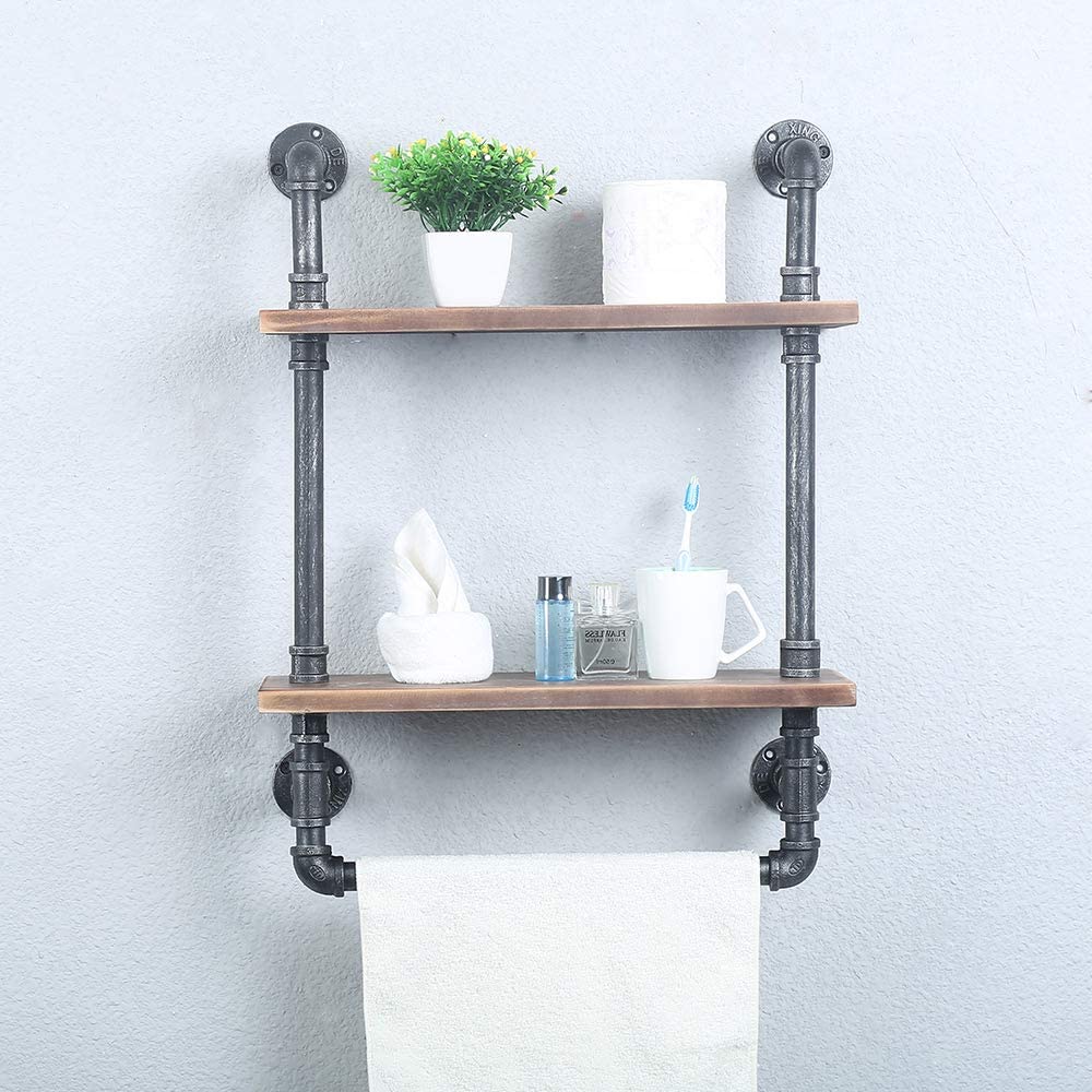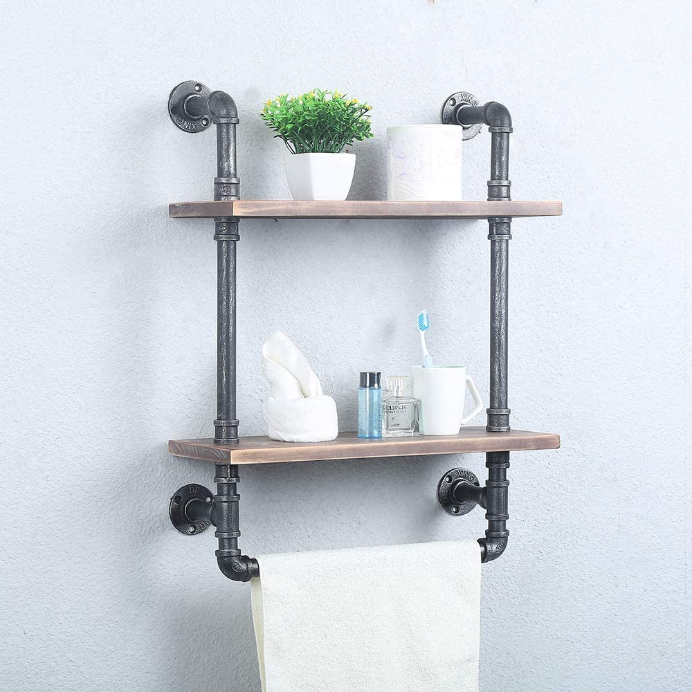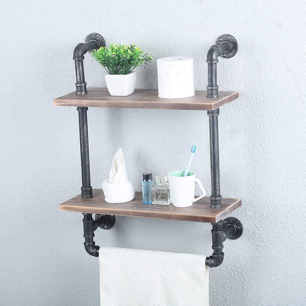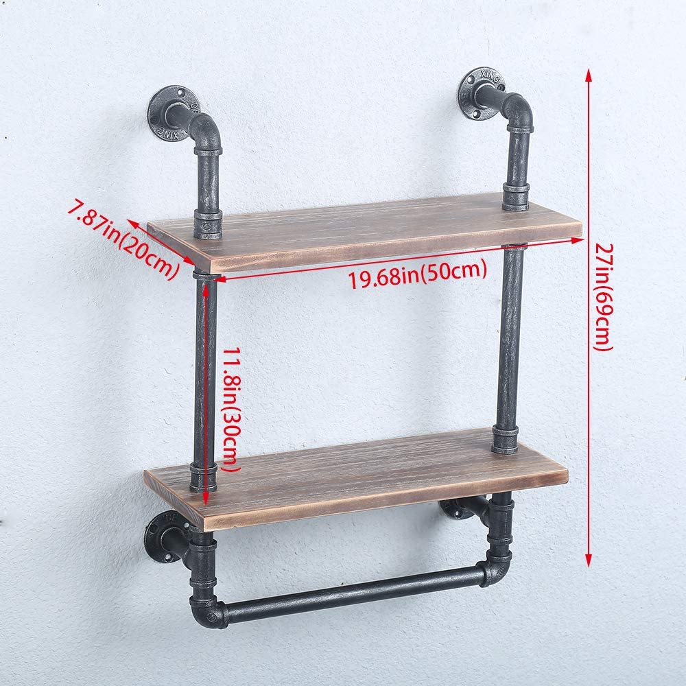 Industrial Bathroom Shelves Wall Mounted 2 Tiered,Rustic 19.68in Pipe Shelving Wood Shelf with Towel Bar,Farmhouse Towel Rack,Metal Floating Shelves Towel Holder,Iron Distressed Shelf Over Toile