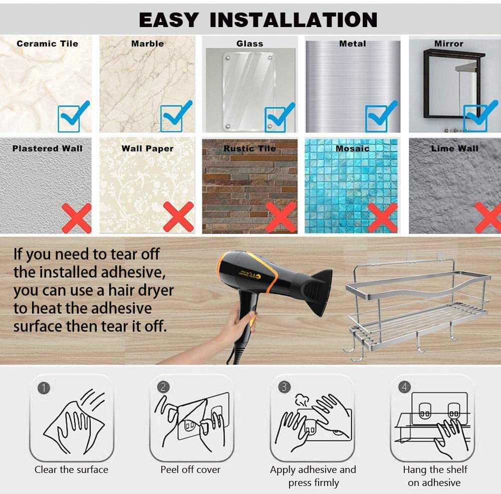 Strong adhesive ensures the bathroom shelf stable enough to support the heavy things. Adhesive design, no drilling needed and no damage to the wall, simple traceless installation.