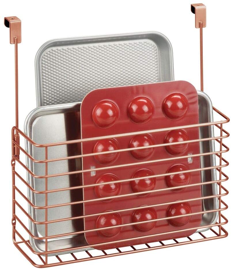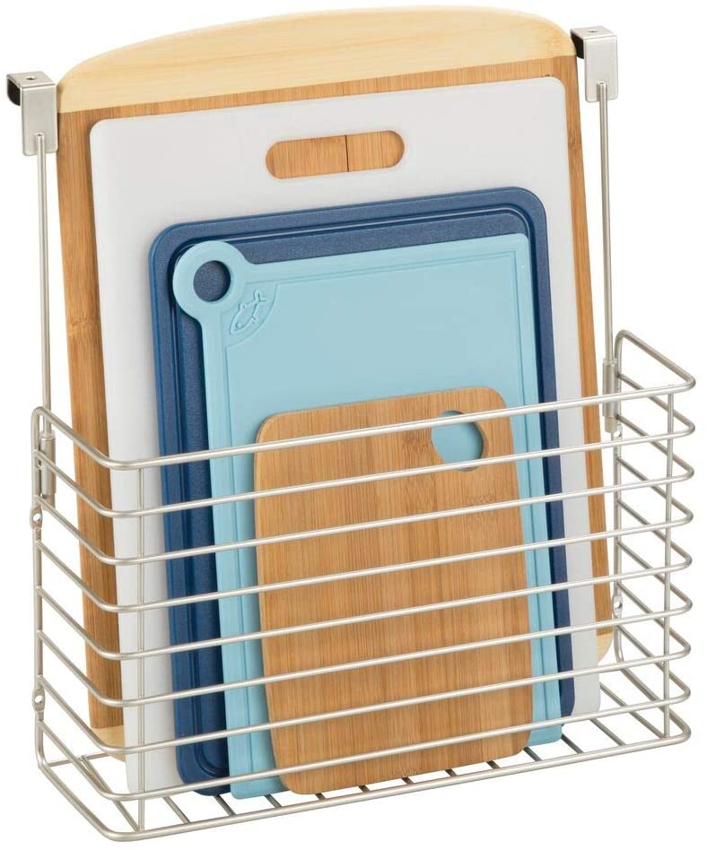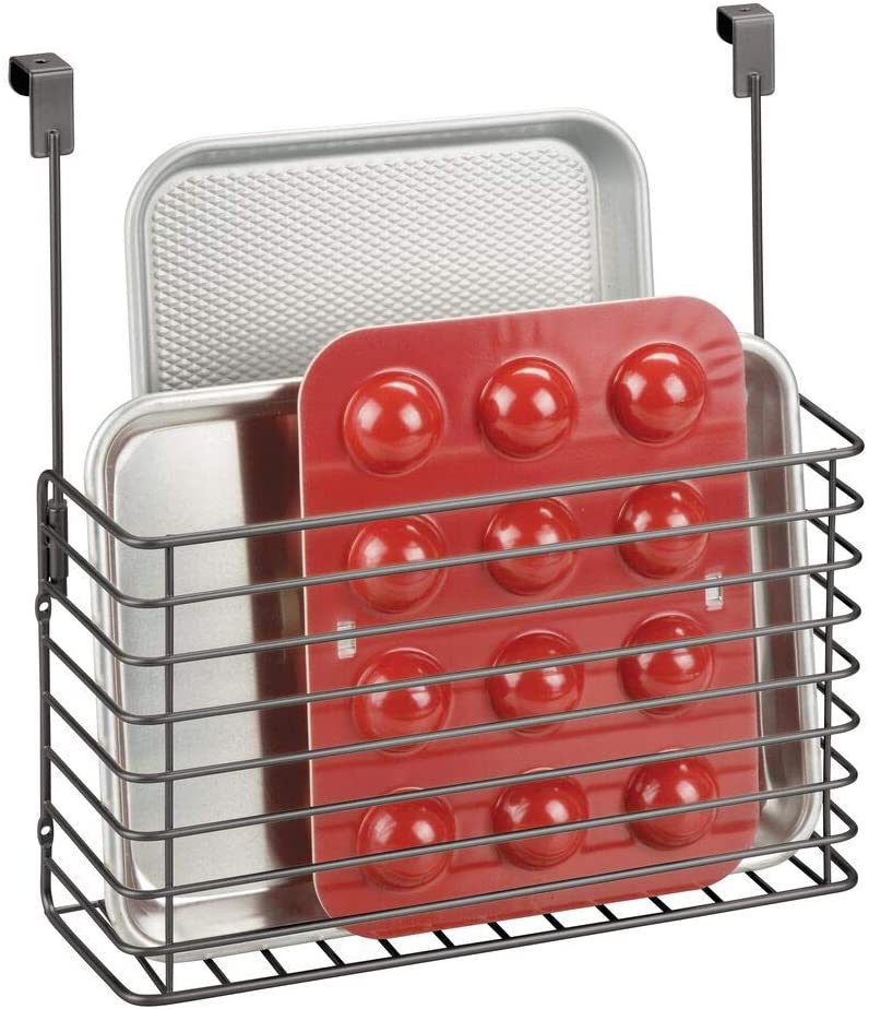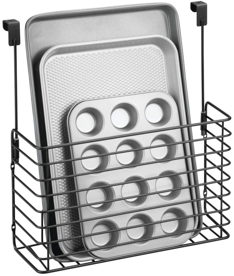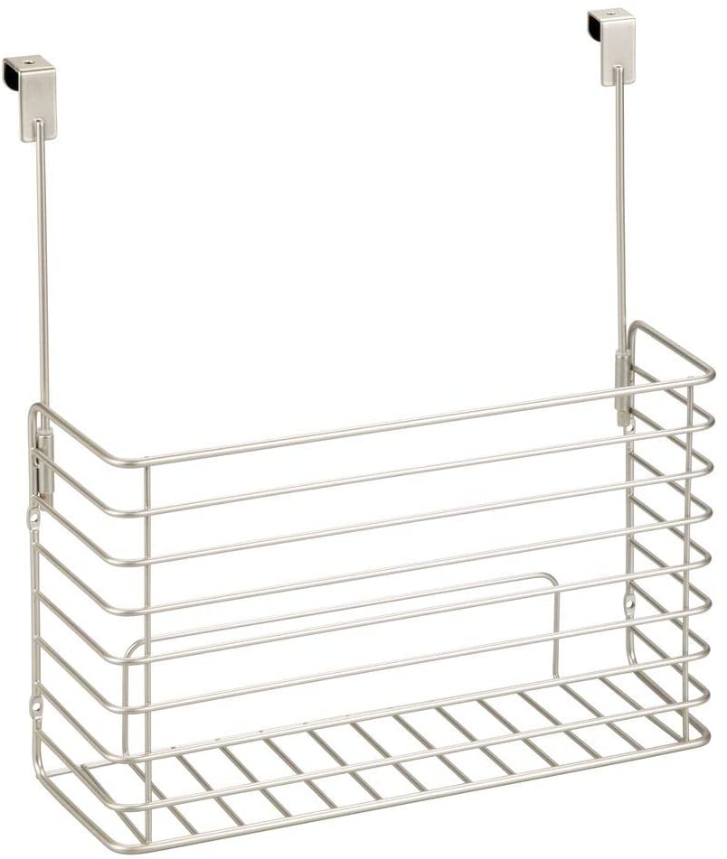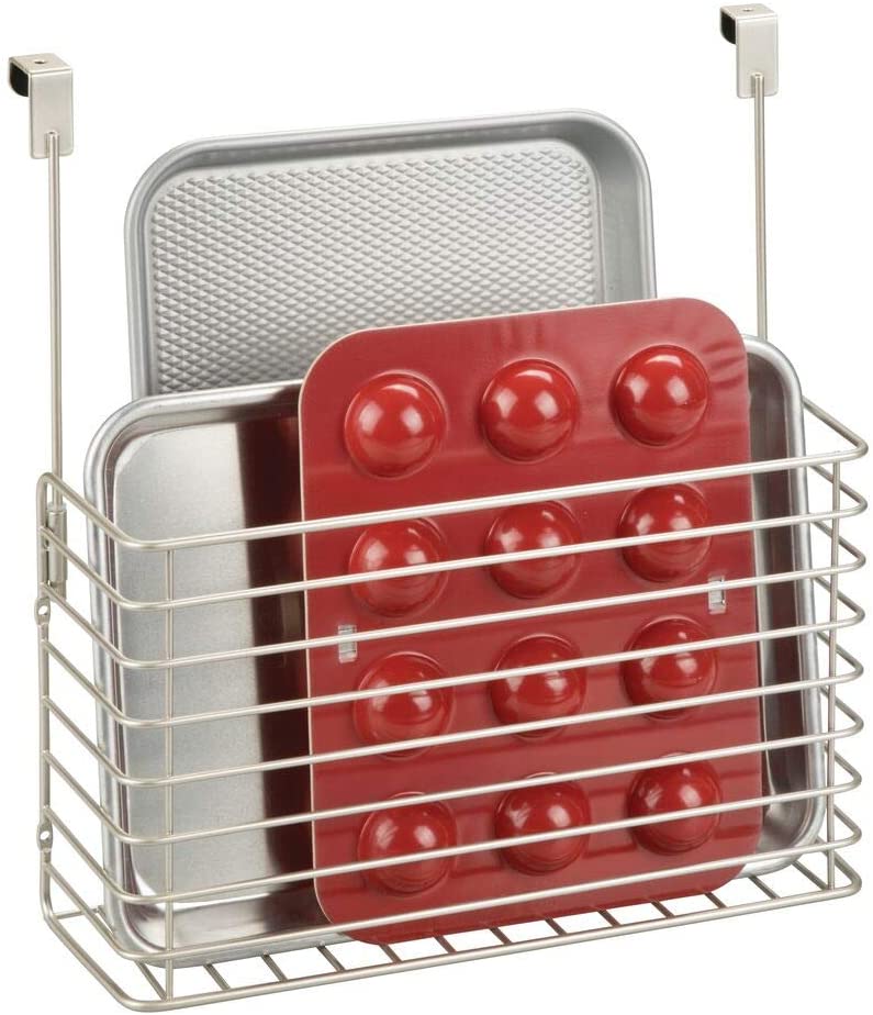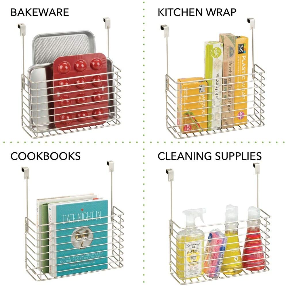 mDesign Metal Over Cabinet Kitchen Storage Organizer Holder or Basket - Hang Over Cabinet Doors in Kitchen/Pantry - Holds Bakeware, Cookbook, Cleaning Supplies - Satin