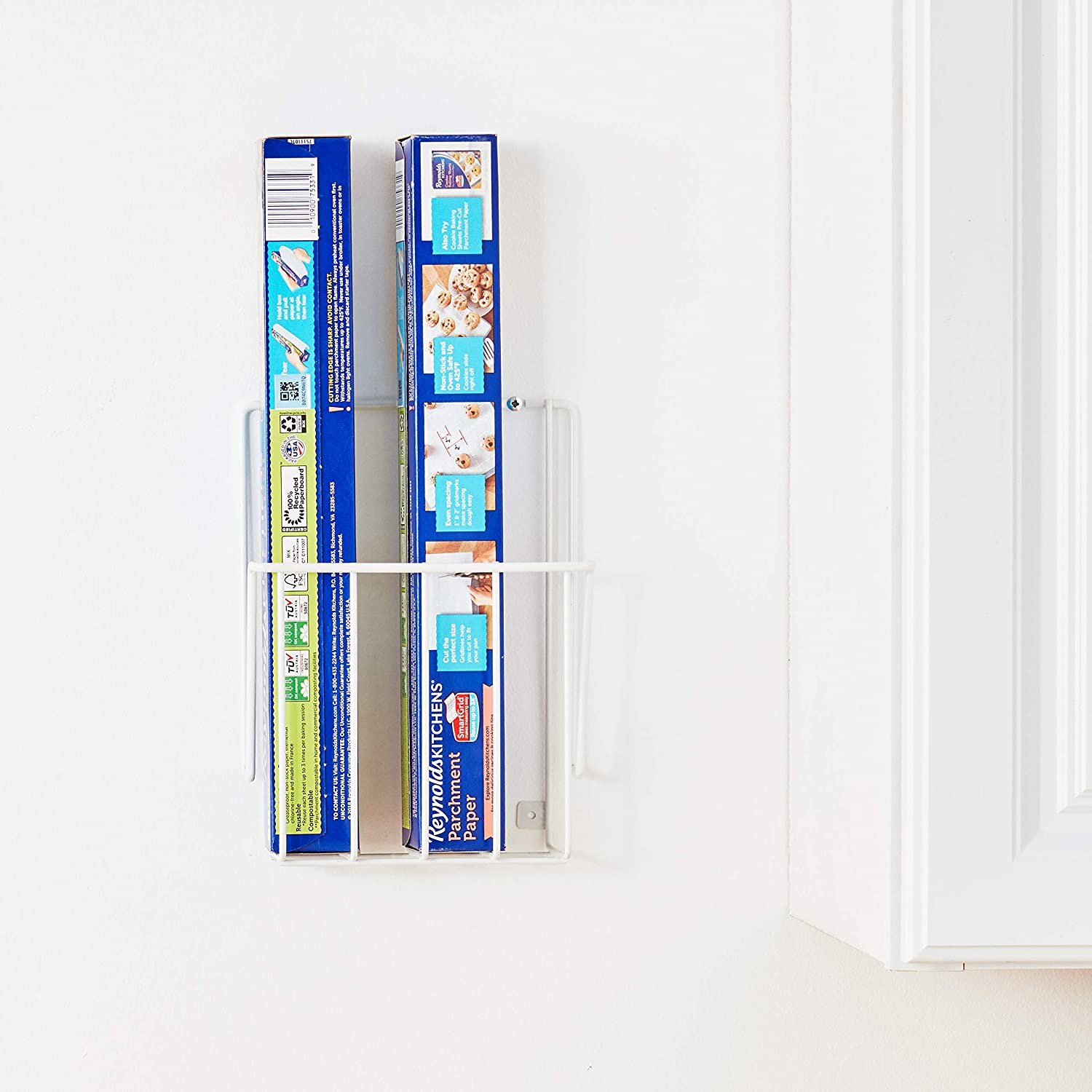 Organize those tricky narrow boxes with the Wall Mount Wrap Rack from Spectrum Diversified. Keep all your cooking supplies nearby. Slide aluminum foil, parchment paper, plastic wrap, cling film and wax paper into the cabinet organizer for easy storage. Rack is sized specifically to hold narrow boxes for compact storage. Use open space within cabinets for storage! Keep aluminum foil, wax paper, parchment paper, cling film, plastic wrap and more inside your kitchen cabinets. Use the inside of cabinet doors to conserve kitchen storage space. Move the boxes out of drawers for easier storage. Clear drawers for your kitchen utensils and baking supplies. Avoid boxes getting stuck inside drawers by storing them in a convenient storage rack. Keep the cooking and baking supplies out of the way by keeping them in this wall-mounted storage rack. Brackets are built into the design for easy mounting; simply insert the screws into the holes and a pre-drilled hole in the wall, then tighten the screws until the rack feels firmly fastened. Mounting hardware included. Made of sturdy steel.