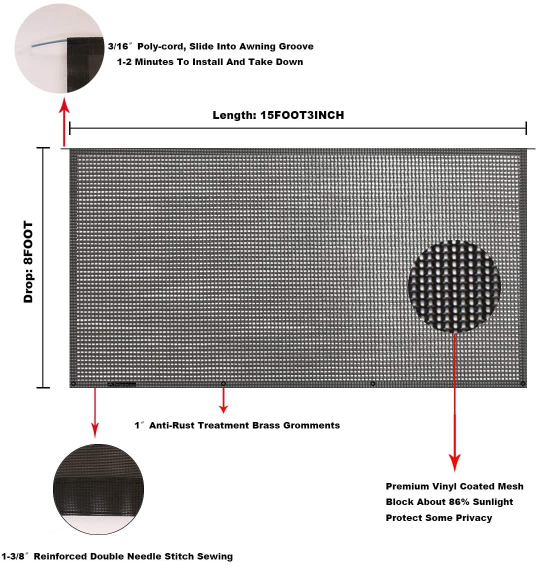 1. Breathable mesh screen blocks about 86% of sun's light but not you view, dramatically lowering the temperature and creating an extra room to your RV.