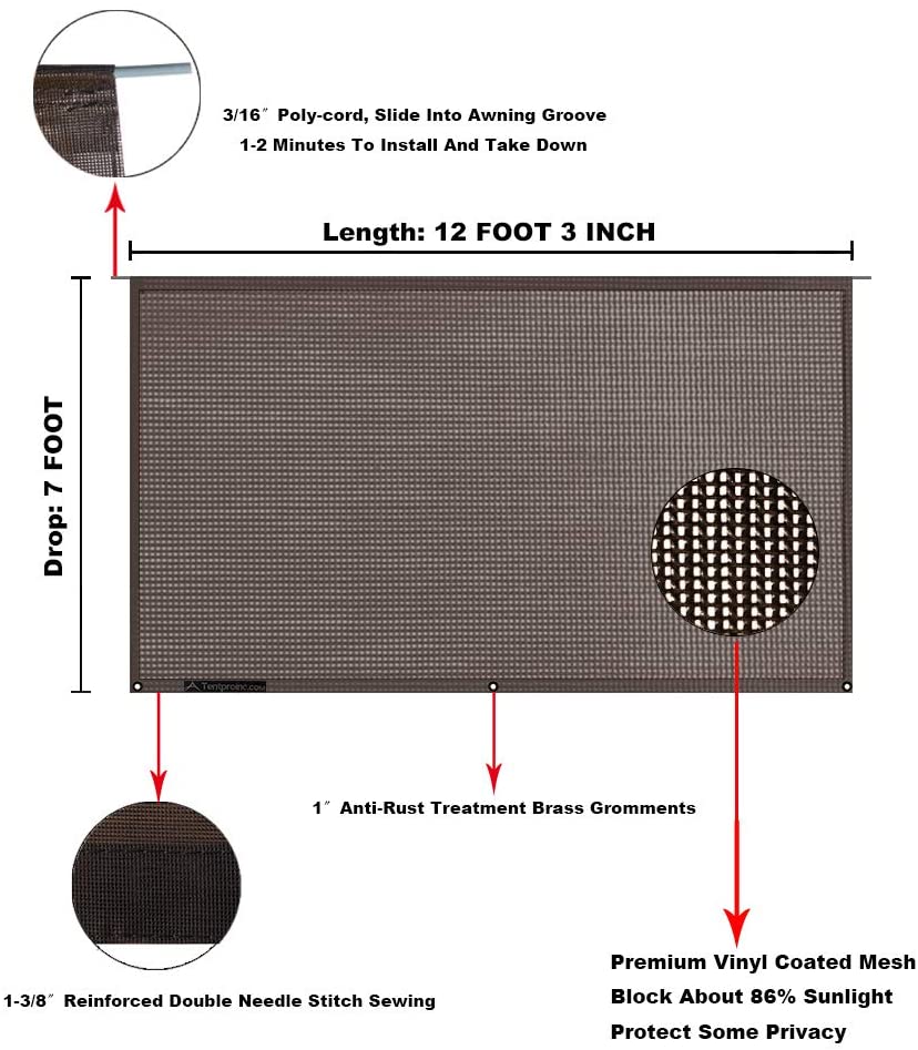 Tentproinc RV Awning Sun Shade Screen 7'X12'3'' Brown Mesh Sunshade UV Sunblocker Complete Kits Drop Motorhome Camping Trailer Canopy Shelter Blocker - 3 Years Limited Warranty