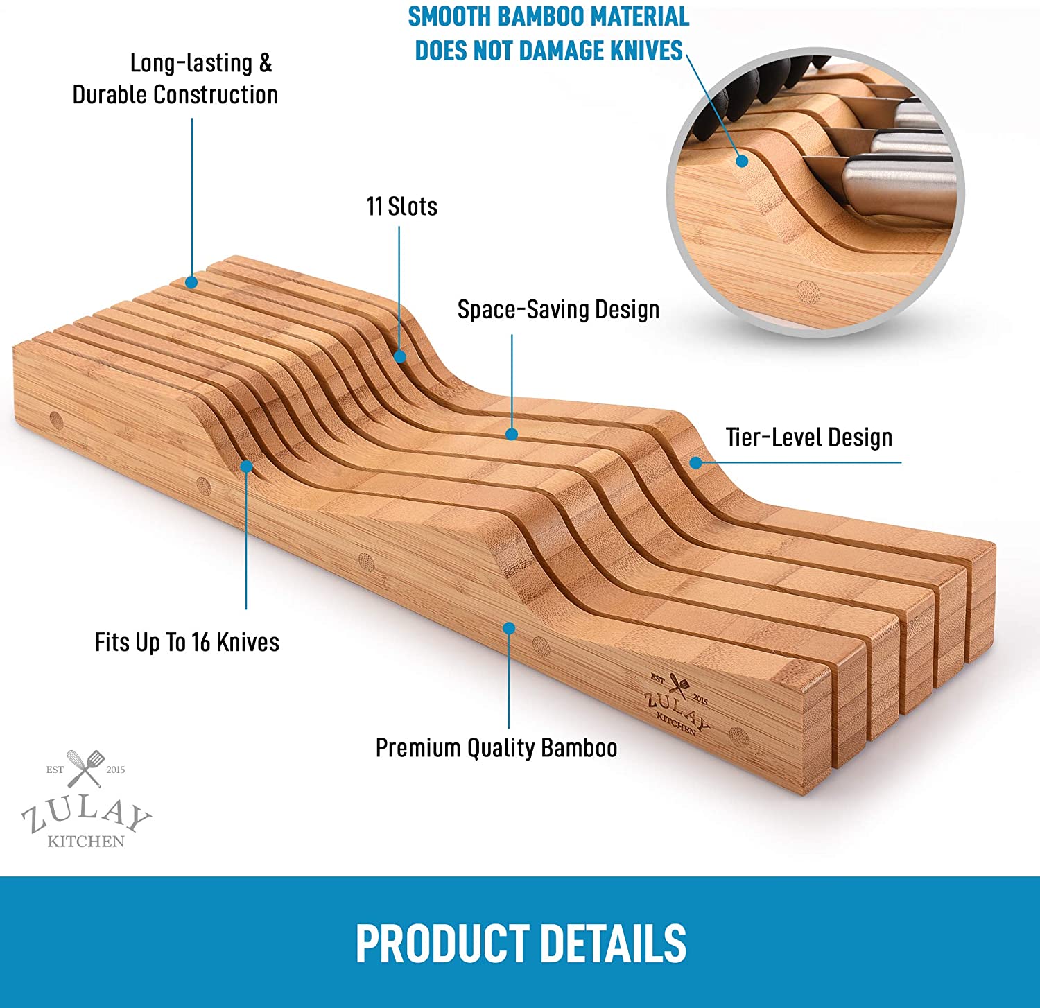 Zulay Kitchen Bamboo Knife Drawer Organizer Insert - Edge-Protecting Knife Organizer Block Holds Up To 16 Knives - Smooth Finish Drawer Knife Organizer Tray Fits In Most Drawers For Kitchen